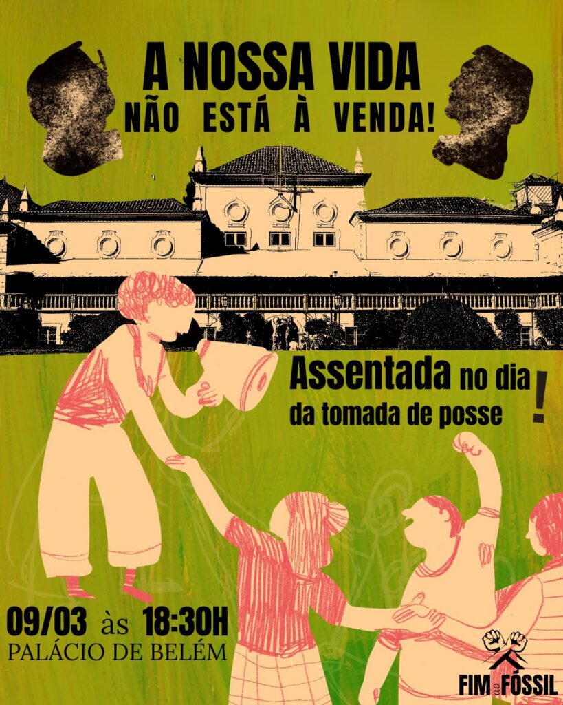 O dia 9 de Março é o dia da tomada de posse do novo Presidente da República, com mandato até 2031 em Portugal. Perante a destruição da bomba “kristin”, a mais recente demonstração que a crise climática está aqui, agora e é devastadora, este presidente não tem qualquer plano de garantir a nossa sobrevivência. Assim, neste dia, 9 de Março, vamos deixar claro que não seremos governáveis por quem quer vender o nosso vida!