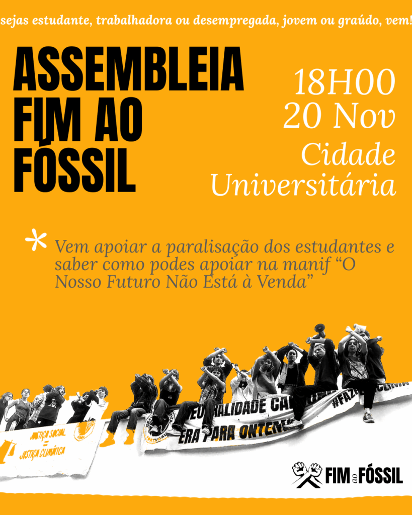Dia 20 de Novembro às 18 horas na Cidade Universitária, esperamos por ti – pessoa trabalhadora ou desempregada, jovem ou graúda – para juntas construirmos a luta pelo Fim ao Fóssil e por uma sociedade em que as nossas vidas valham mais que o lucro.