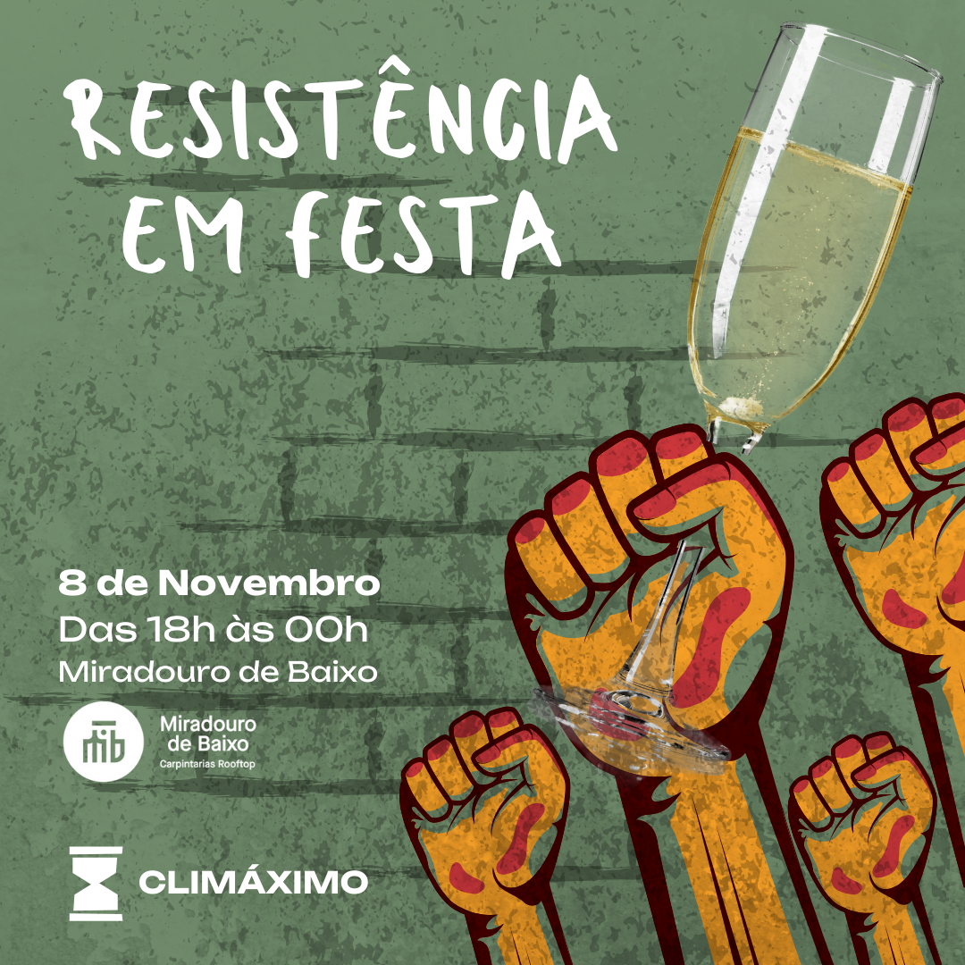 Tags EventoResistência em Festa – 8 NOV – noite de DJ set e concertos!Climáximo 4 Novembro 2024 Celebrar também é resistir. Aparece no dia 8 de novembro entre as 18h e as 00h no Miradouro de Baixo,