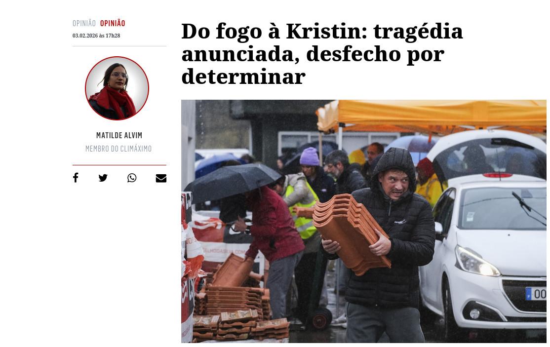 Tags ArtigoDo fogo à Kristin: tragédia anunciada, desfecho por determinarClimáximo 3 Fevereiro 2026 A crise climática não é o cenário apocalíptico Hollywoodesco em que, quase do dia para a noite, o fim do…
