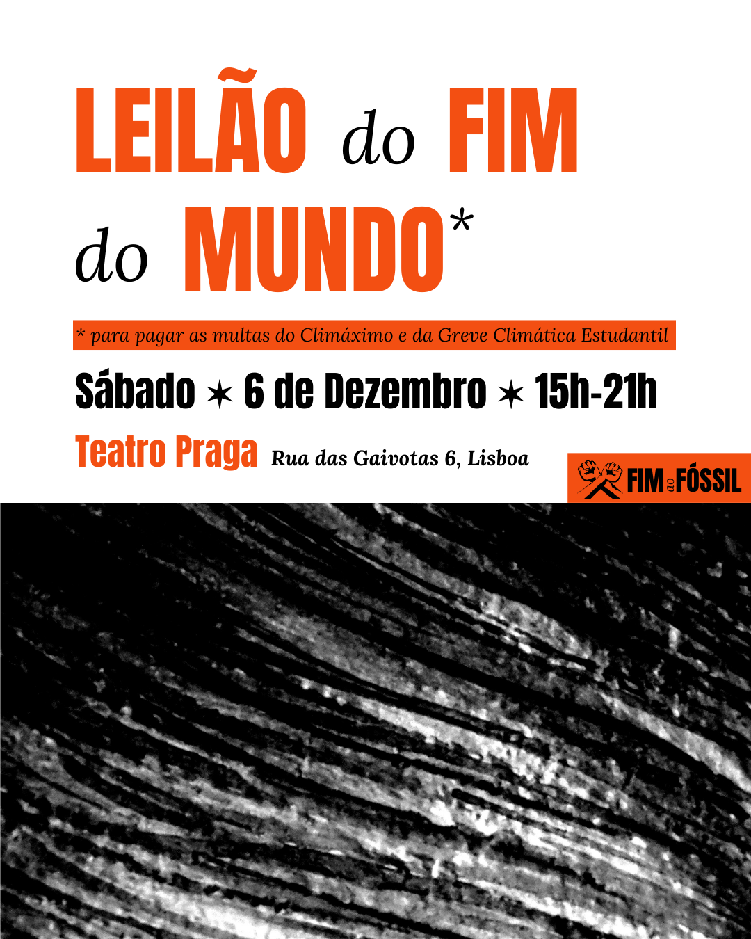 Tags EventoLeilão do Fim do Mundo | 6 DezembroClimáximo 25 Novembro 2025 2º leilão de artistas pelo clima para ajudar a pagar as multas do Climáximo e da Greve Climática Estudantil –