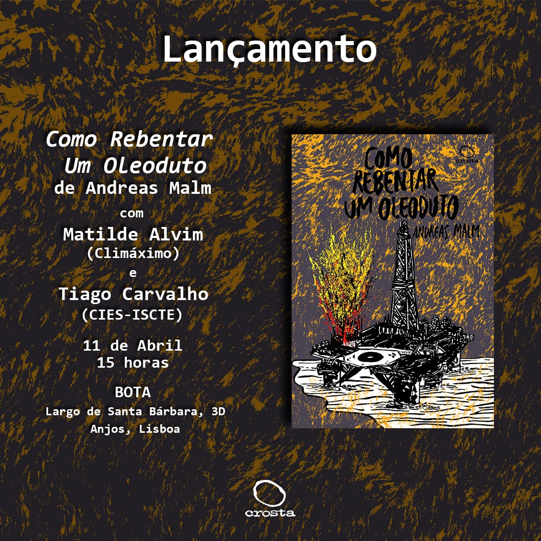Post lançamento livro “como rebentar com um oleoduto” | 11 AbrilClimáximo 6 Abril 2026 Vamos estar no lançamento da edição portuguesa do livro “Como Rebentar Um Oleoduto” de Andreas Malm. Em Portugal, o livro