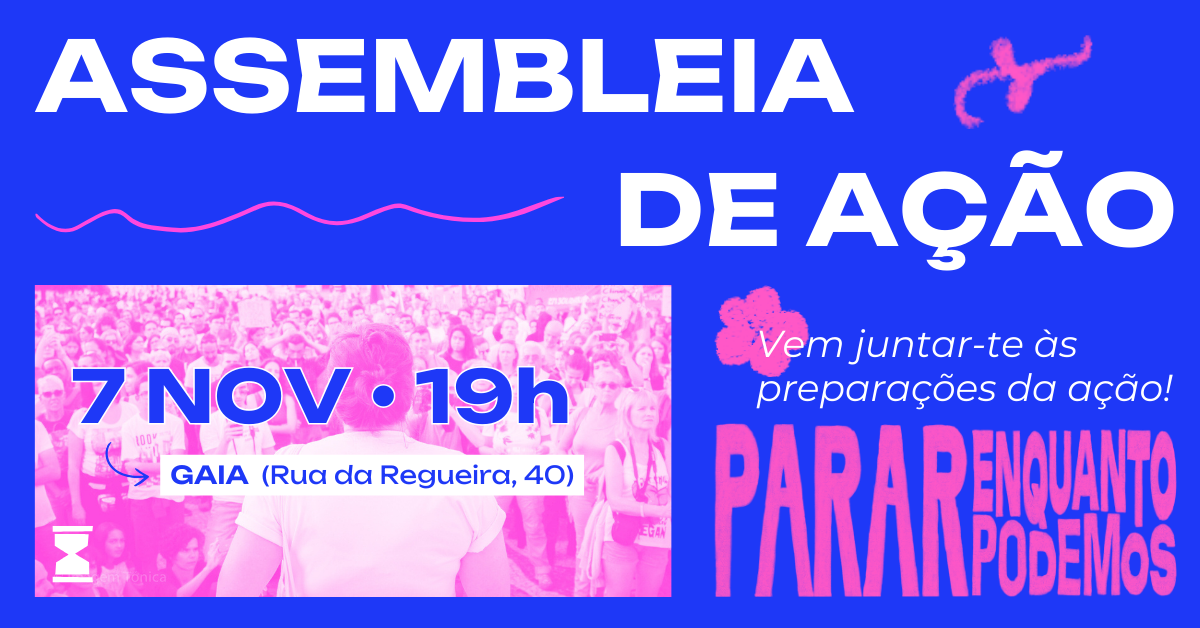 Assembleia de ação | 7 NovClimáximo 4 Novembro 2024 📢 Participa na próxima assembleia de ação Parar Enquanto Podemos: 7 Nov (quinta-feira), 19h, GAIA (R. da Regueira, 40) Este