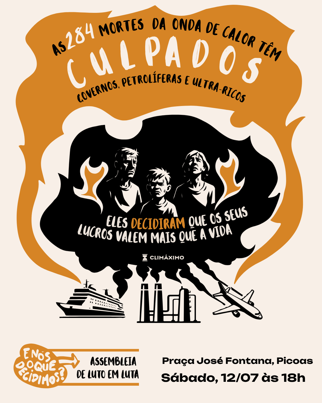 Convocatória: Assembleia Popular “De Luto E Em Luta”, Sábado Dia 12 De Julho. Os Governos, As Empresas Petrolíferas E Ultra-Ricos Mataram Quase 300 Pessoas Na Onda De Calor.Climáximo 8 Julho 2025 A Direção Geral de Saúde revelou que a onda de calor que assolou Portugal provocou quase 300 mortes. É preciso