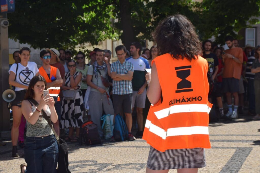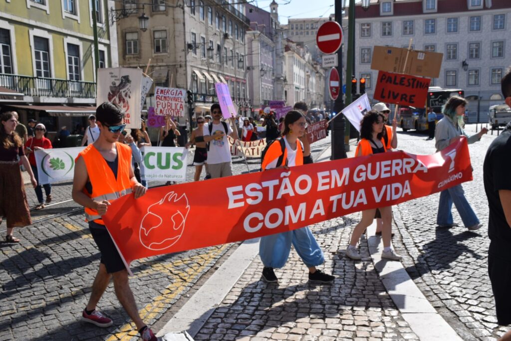 No início da marcha, ainda no Largo Camões, discursámos sobre as reivindicações que destacámos: 0 novos projectos emissores, o cancelamento da dívida do Sul Global, e uma transição energética justa que o 1℅ pague.