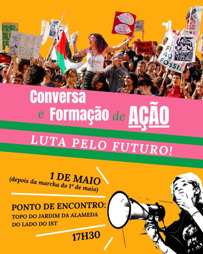 Das 17h30 às 20h vamos estar na Alameda (parte do relvado mais perto do IST) pós manif do 1 de Maio, para falarmos sobre as ações da semana, para poderes partilhar duvidas, receios e vontades e para te aprenderes informações básicas de ação directa. É importante participares o tempo inteiro.