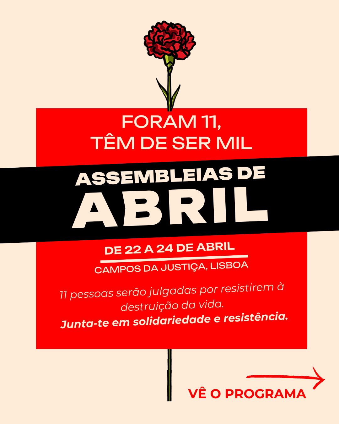 Enquanto 11 pessoas serão julgadas nos dias antes do 25 de Abril por lutarem pela vida, o que vamos nós estar a fazer? Junta-te às Assembleias de Abril – estes serão dias de solidariedade e resistência, que acontecerão ao longo dos 3 dias do julgamento, das 8h00 às 22h00, no Campus da Justiça em Lisboa.