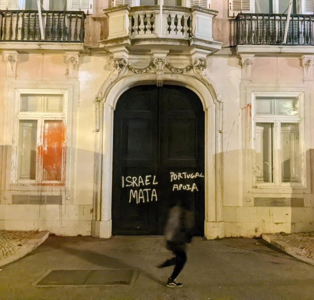 Um grupo solidário com a resistência palestiniana e com o Coletivo pela Libertação da Palestina, o Climáximo e a Greve Climática Estudantil de Lisboa pintaram na fachada do edifício a frase: “Israel mata, Portugal apoia”. Denunciam o apoio do governo português e, particularmente, do Ministério dos Negócios Estrangeiros, a um projeto colonial que, há mais de 75 anos, tem por base a limpeza étnica do povo palestiniano.