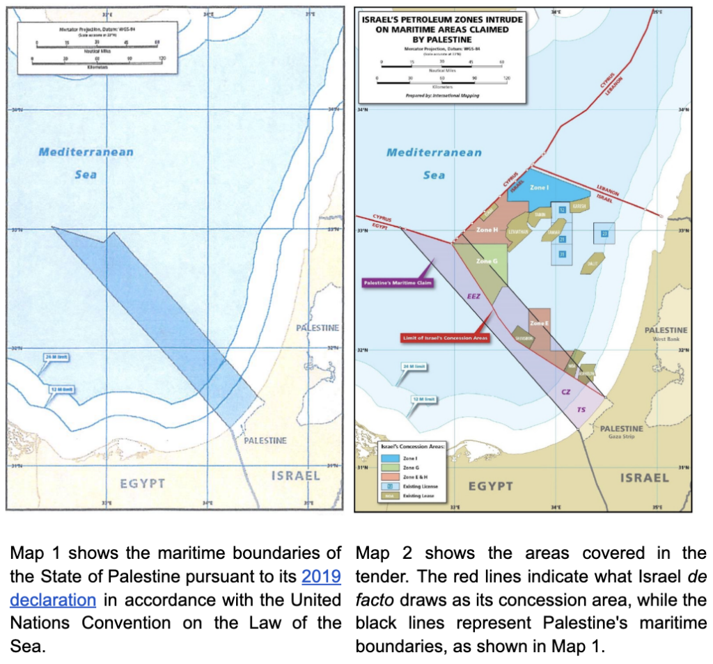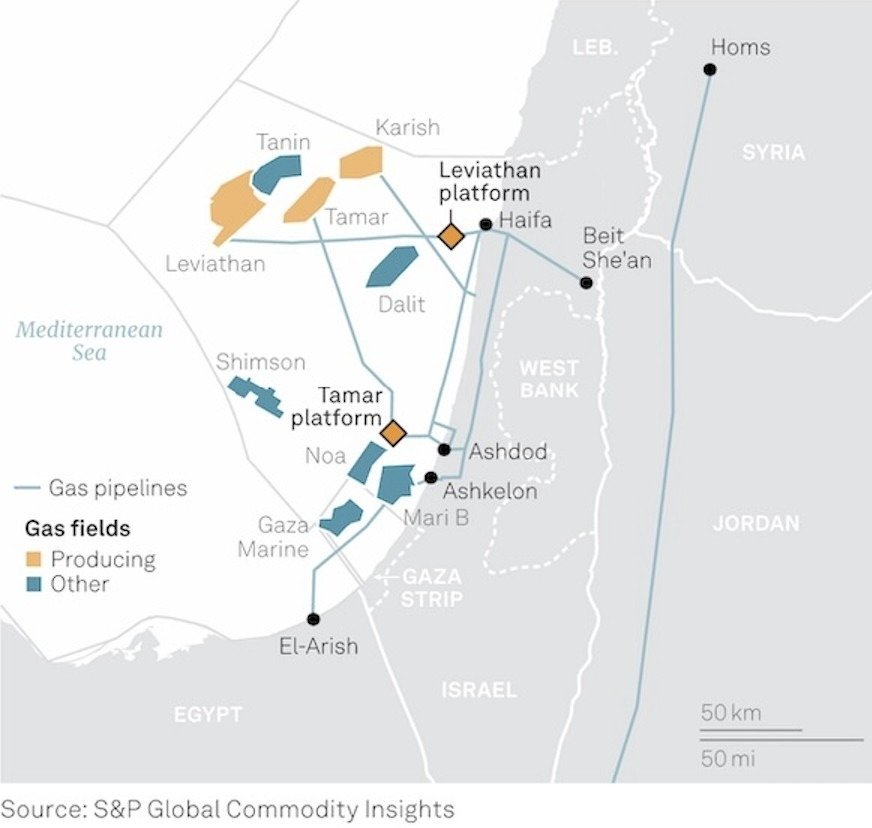 Em Outubro de 2023 uma das plataformas de extração, Tamar, teve parada durante algumas semanas mas rapidamente voltou ao seu funcionamento. Esta plataforma da qual a americana Chevron é uma das empresas principais envolvidas, é visível a olho nu da costa de Gaza. A outra grande plataforma é a Leviathan, cuja jazida uma “bomba de carbono” que deverá produzir cerca de 1,1 gigatoneladas de dióxido de carbono ao longo do seu ciclo de vida. Esta jazida de gás, a maior das descobertas recentes, tem 22 biliões de pés cúbicos de gás natural e estende-se ao longo da costa, desde Beirute, passando por Akka, até Gaza. Por fim é de notar que as principais jazidas de gás descobertas, Karish e Leviathan, encontram-se igualmente em águas reivindicadas pelo Líbano, sendo isto igualmente ignorado por Israel.