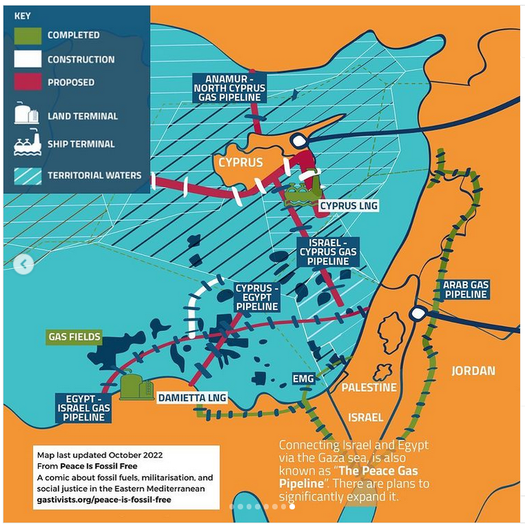 Esta gás extraído é depois enviado para a UE, EUA e Egito. Assim, a cooperação energética entre os Estados Unidos e Israel e a acumulação de recursos naturais por Israel são do interesse estratégico dos Estados Unidos, tendo prometido ajudar Israel em “questões de segurança regional”. Outro exemplo relevante é a Alemanha que em 2015 vendeu quatro navios de guerra a Israel para que este país pudesse defender melhor as suas plataformas de gás contra qualquer eventualidade, continuando atualmente a dar diversas formas de apoio as suas crimes. Mas como é que este gás é enviado para outros países? Ora bem, por um gasoduto que passa pelo mar da palestina, em particular de Gaza, detido (de novo) pela Chevron. Adicionalmente, há 2 novos gasodutos que pretende construir, sendo o mais conhecido o EASTMED contra o qual existe uma resistência local – lê mais sobre isso aqui.