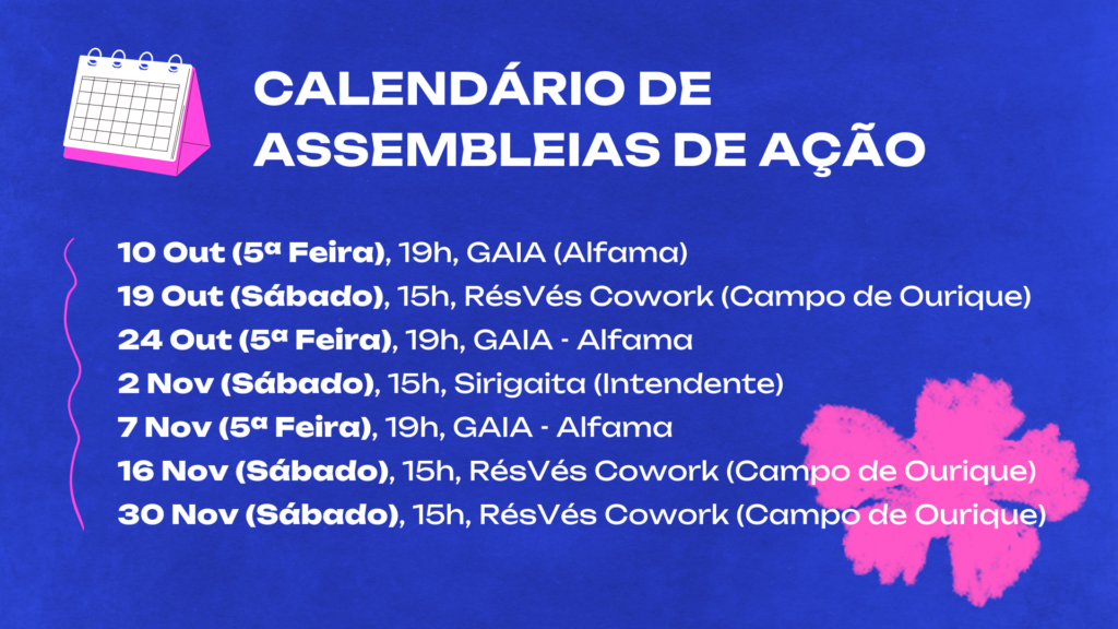 Se não tiveres disponibilidade para participar em nenhuma das assembleias mas quiseres na mesma envolver-te na preparação desta ação, preenche o formulário no separador abaixo e iremos contactar-te sobre como podes participar!