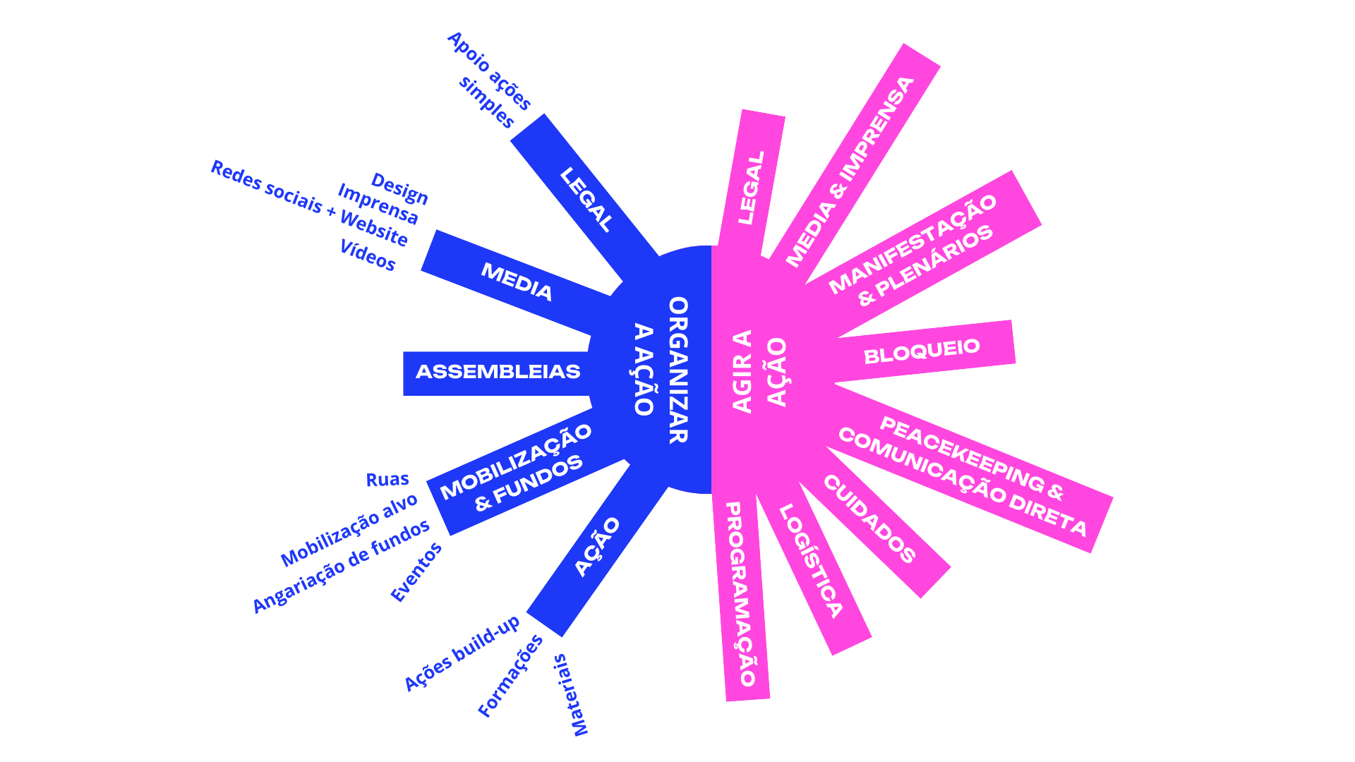 Quer gostes mais de fazer design gráfico, de mobilizar o máximo número de pessoas para vir à manifestação ou ação, ou de ajudar em dar apoio legal à ação, há uma equipa para ti na construção da ação.